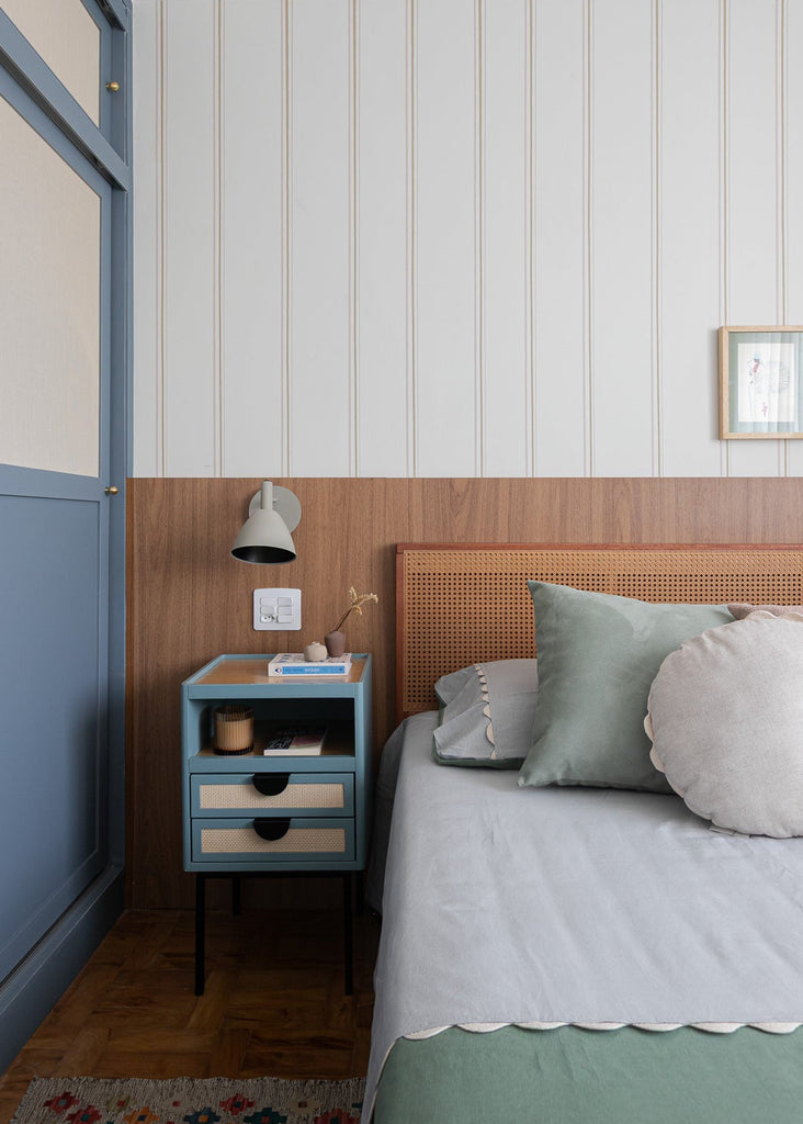 Material: Papel de parede non woven 80% celulose 20% fibras sintéticas (para dar estabilidade e a limpeza mais fácil). Sua base é offwhite e tem leve textura, conferindo um aspecto mais aconchegante.