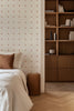 Material: Papel de parede non woven 80% celulose 20% fibras sintéticas (para dar estabilidade e a limpeza mais fácil). Sua base é offwhite e tem leve textura, conferindo um aspecto mais aconchegante.