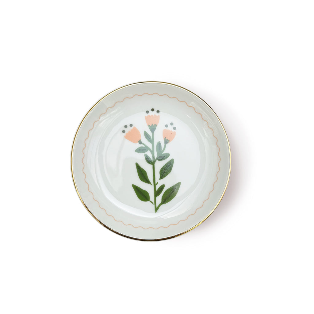 Pratinho em porcelana redondo, 10,5 cm de diâmetro, friso e detalhes em dourado.