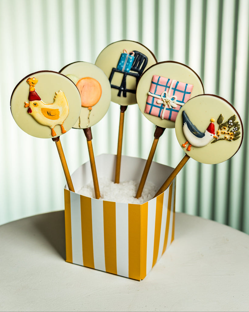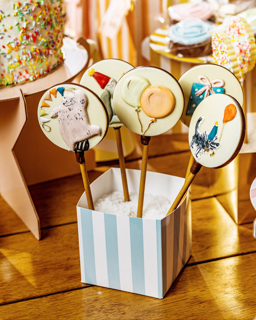 Estúdio Papel10 pirulitos de chocolate ao leite pintados a mão ilustrados com o tema Dia de festa.