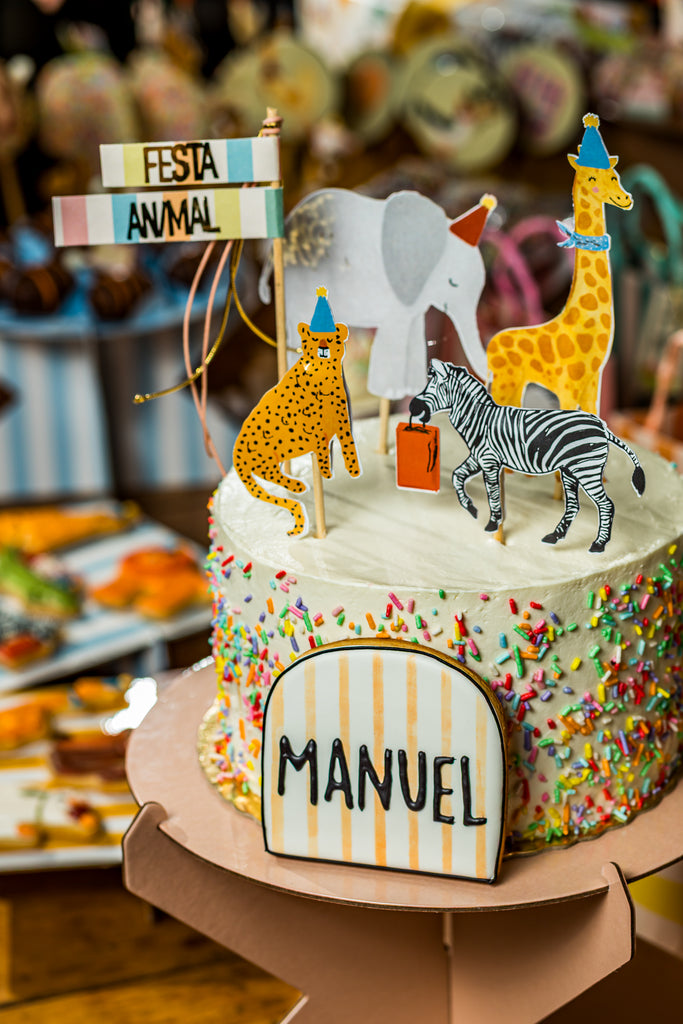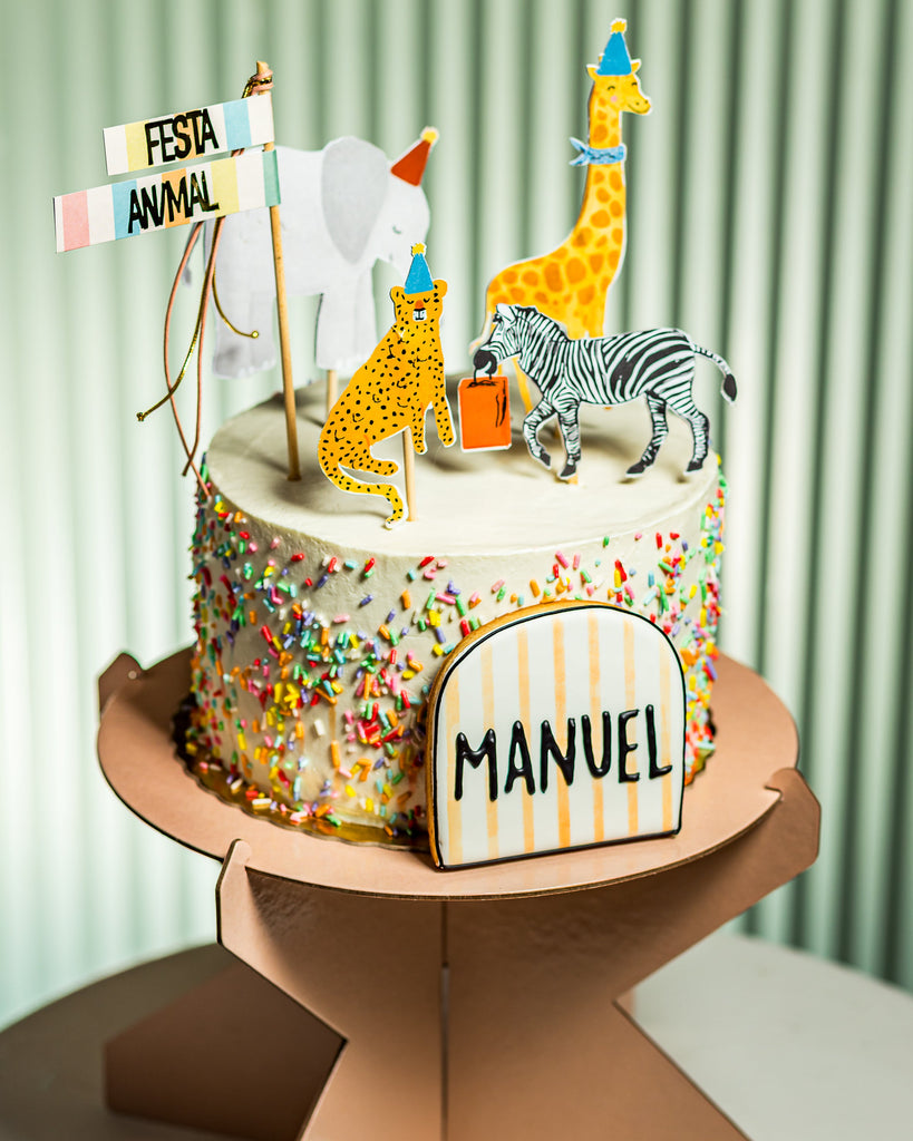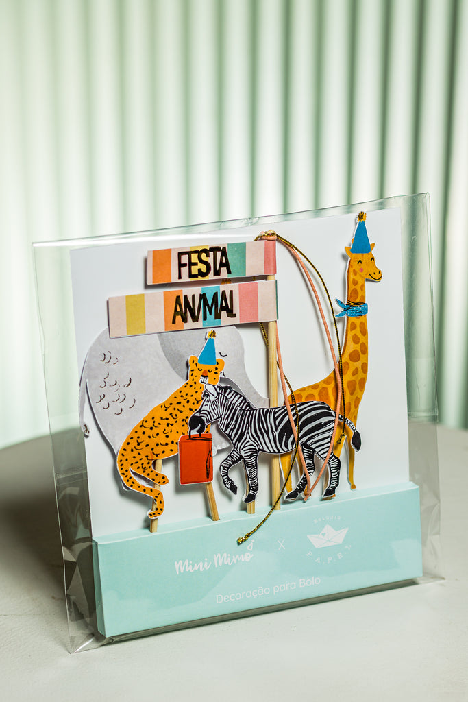 Estúdio Papel5 Topos: Bandeiras Festa Animal; Girafa, Elefante, Zebra, Onça finalizados com camada dupla de papel e detalhes dourados.